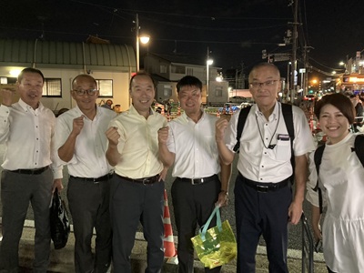 そして、17:25から17:45まで、今川宇治市議会議員の司会、平戸参議院議員の応援演説で、JR長岡京駅東口にてスポット演説を行い、7期目においても自身の政策である「未来を築く6つの政策」の推進により、民間企業出身の議員だからこそできる徹底した行財政改革の実行により、生み出した財源を必要なところに優先的に使っていきたい想いや、建設が進む長岡京市役所新庁舎2期棟での複合化事例や、これからも公共施設の複合化を推進していくべき想いなどについて、訴えさせていただきました。