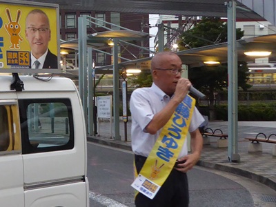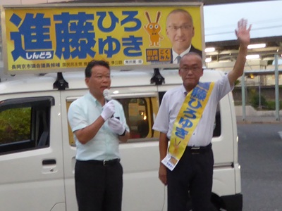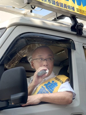また、14:00から18:00までは、隠塚功京都市会議員に街宣車に同乗いただき、一緒に市内を走らせていただき、街宣中、竹の台団地とJR長岡京駅西口ロータリーでスポット演説を行わせていただきました。