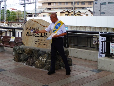そして2日目の最後は、19:25から19:50頃まで、朝の街頭活動を行った阪急西山天王山駅西改札口にて、帰宅される皆さまに夜の街頭活動をさせていただきました。