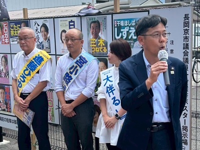 また、この日は街宣活動中になりますが、12:00から12:25頃まで、長岡京市役所前にて、会派輝の現職候補5名と当選されれば会派輝に迎え入れることになる新人候補2名の、計7名による合同街頭演説会を行い、中小路健吾市長に応援演説をいただきました。
