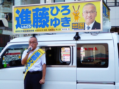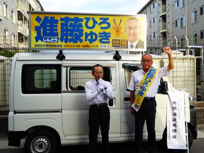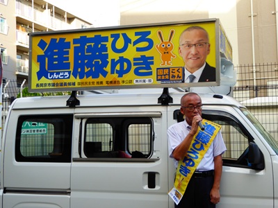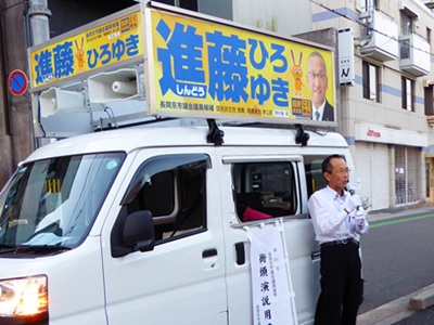 その後は、「進藤ひろゆき」頑張れと応援に来ていただいた議員さんたちとともに終日街宣車に乗り込み、この7期目の選挙戦にかける想いを訴えに市内を走りました。