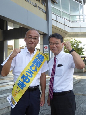 市議会議員選挙も後半戦に入り、5日目の10/2(木)は、7:05から7:45までいつものアゼリア通りとセブン通りのT字交差点での朝の挨拶活動の後、8:10から8:50までJR長岡京駅西口にて、隠塚功京都市会議員、中野洋一京都市会議員と一緒に、通勤・通学される皆さまに朝の街頭活動をさせていただきました。