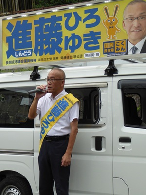 その後は、「進藤ひろゆき」頑張れと応援に来ていただいた議員さんたちとともに終日街宣車に乗り込み、この7期目の選挙戦にかける想いを訴えに市内を走りました。